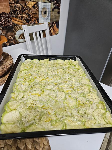 Spălați dovleceii și-i tăiați felii foarte subțiri, aici aș recomanda neapărat un feliator de tip mandolină, să obțineți feliile subțiri și uniforme într-un mod rapid și simplu.