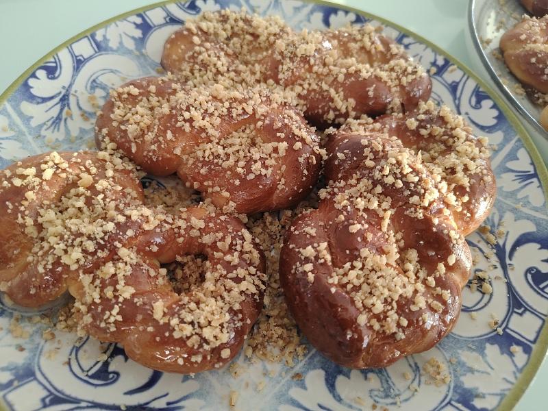 Aluatul pentru Mucenicii Moldovenești s-a odihnit și a crescut, cu un cuțit îl tăiați în 16 bucăți uniforme.