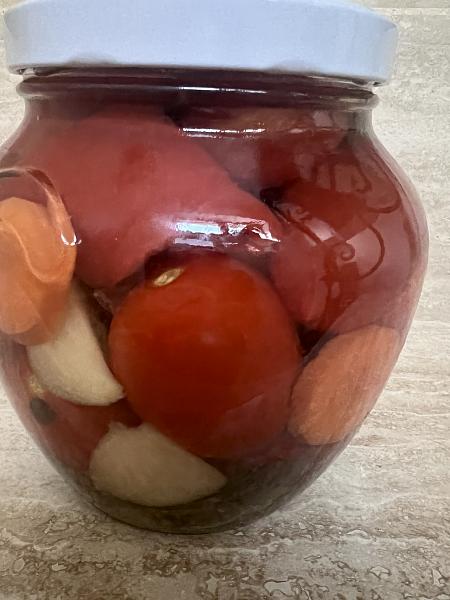 Atunci în vizitele astea a luat mama rețeta mătușii de roșii marinate și a făcut furori cu ea - au preluat-o în timp toate rudele și vecinii.